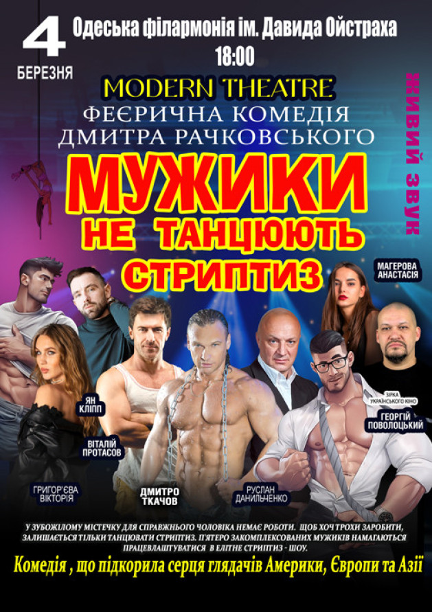 Вони: офіцер спецназу, бандит, музикант і збанкрутілий бізнесмен. Кожен з них гідний кращого, але життя склалося так, як склалося.У кожного своя доля, своя трагедія. У них немає роботи, немає грошей. Єдина їх надія - елітне чоловіче стриптиз-шоу, в яке ще треба потрапити. Ніхто з них раніше нічим подібним не займався, їм страшно і смішно одночасно, але це їхній останній шанс - отримати можливість заробляти хороші гроші, а заразом довести оточенню і самим собі, що нічого неможливого немає, головне - сильно захотіти! Поки четверо закомплексованих мужиків, навчаться більш менш правильно рухатися і при цьому скидати одяг, зал задихнеться від сміху. Сидячи в залі для глядачів, ми сміємося і щиро переживаємо за наших героїв, і з кожною хвилиною стаємо все ближче і ближче до розв'язки подій. Фінал цієї незвичайної історії - феєричне шоу, що несе заряд емоцій, загострення пристрастей і божевільну любов до неї, до жінки, а жінці дуже корисно вдосталь, до сліз, до кольок посміятися. Навіть, напевно, корисніше, ніж подивитися на голого мужика.