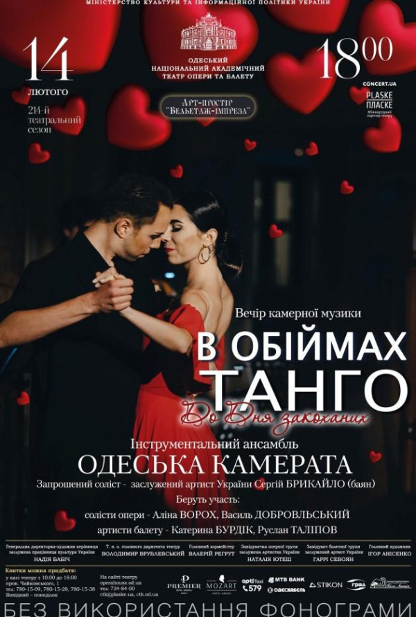 «В обіймах танго. Літо» – це вишуканий вечір камерної музики в театральному арт-просторі “Бельетаж-імпреза” за участі ансамблю артистів оркестру театру “Одеська Камерата”. В програмі концерту інструментальна та вокальна музика найвідоміших композиторів музики танго: А. П’яццоли, К. Гарделя, Р. Гальяно. В оновленій програмі концерту вперше прозвучить українське танго, яке точно не залишить байдужим нікого з вас. Вечори камерної музики “В обіймах танго” – це інший паралельний світ зі своїми законами. Інша філософія та інша реальність, солодкий полон музики, кохання та фантазії…