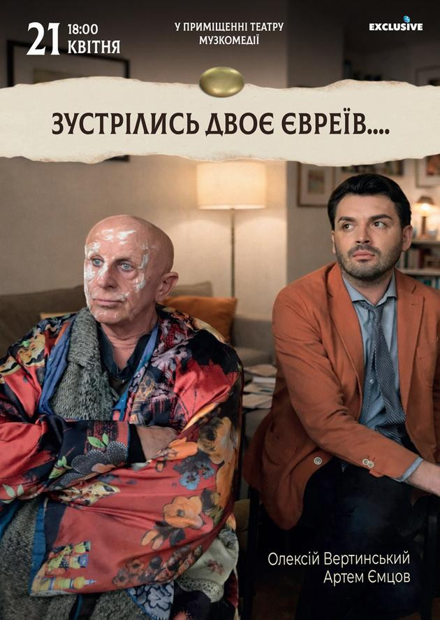 Давно не дивилися гарної ліричної комедії? Тоді не пропустіть цієї постановки! "Зустрілись двоє євреїв..." - це історія про взаємини двох чоловіків, євреїв. Свів їхній нещасний випадок: один збив іншого на дорозі. Наші герої – молодий хлопець та літній самотній чоловік. І тепер хлопцю доводиться доглядати старого: такий вирок суду. Але як бути, якщо потерпілий – не бажає йти на контакт і віддає перевагу самоті? Надздібності та кмітливість, всілякі хитрощі – про це та багато іншого виставу "Коли зустрічаються два євреї". Постановка змусить неодноразово посміхнутися і замислитися над тим, як часом випадок зближує двох абсолютно різних, на перший погляд, людей. Режисер – Ольга Гаврилюк Ролі виконують Народний артист України Олексій Вертинський та Артем Ємцов